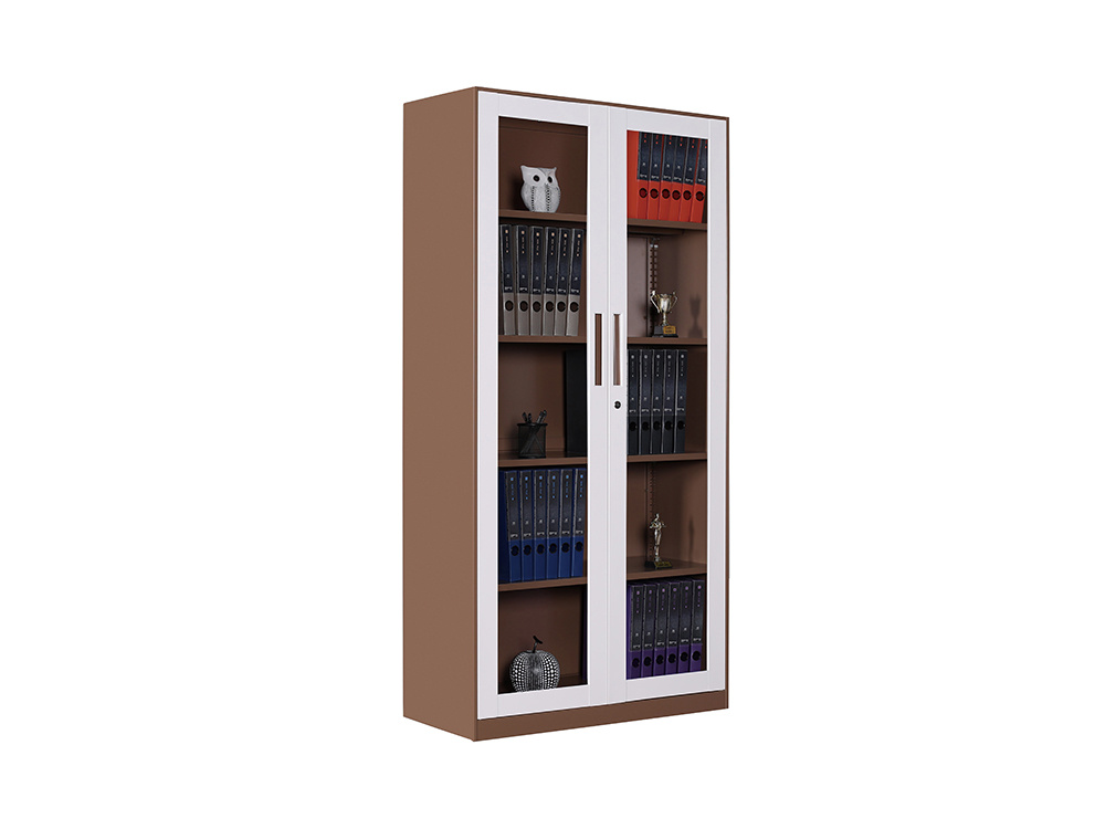 ● 一體結構設置,上部玻璃對開(kāi)門(mén),內置1層層板可調高度,內置物品可視,便于拿取,中間2個(gè)抽屜,下部對開(kāi)鐵門(mén)、門(mén)內一格板,設置有拉手和鎖。